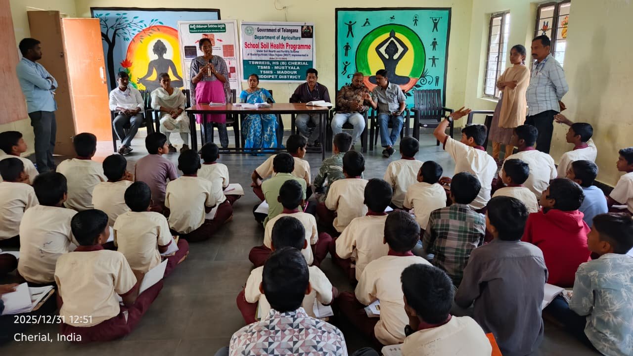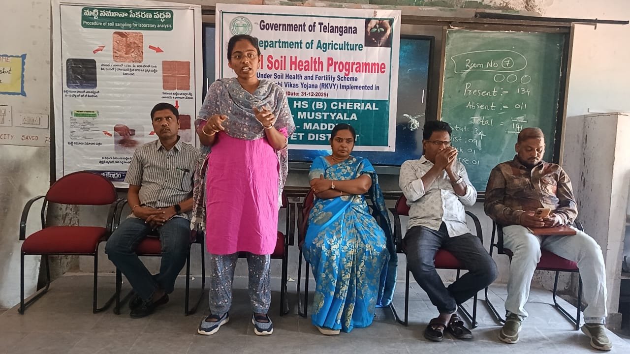 Awareness programme on soil sampling procedure and School Soil Health Programme at TSMS, Maddur School, TSMS, Mustyala School, TSWREISHS (Boys), Cherial School, TSMS, Kondapaka School and ZPHS, Kodakandla school by TRVK, Siddipet on 31.12.2025. Dr. Ch. Pallavi, Coordinator & Scientist, TRVK, Siddipet also explained about the importance of soil testing, procedure for soil sampling methods for efficient nutrient management and advantages of soil sampling. Soil testing is an integral part of a soil fertility management program. Effective soil testing provides information on the fertility status of soils within a field that can be used for making fertilizer recommendations, changes in soil fertility over time and even identifying and targeting low fertility soils within larger fields. Informative soil sampling can improve on-farm nutrient efficiency, leading to increased return on investment for fertilizer and decreased risk of off-site nutrient movement.  We also explained about the facility of soil testing available at ARS, Tornala along with cost for analysis. In this programme, ADA (Cherial division) Smt. T. Radhika, Mandal Agriculture Officers P. Bogeshwar Swamy (Cherial), B. Ramakrishna (Maddur) and AEOs & ATM (G. Dileep, B. Kranthi kumar, R. Praveen, Aashlesha, Narsimhulu) along with nodal in-charge from each school & 300 Students have participated in the programme.