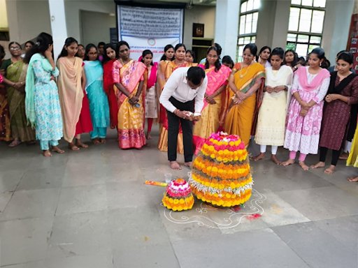Bathukamma, the floral festival of Telangana, was celebrated with great enthusiasm and cultural pride at campus on 25.09.2025. The event was organized by Women Protection Cell to promote and preserve the rich traditions of Telangana. Students, teaching and non-teaching staff, especially women, came dressed in traditional attire. Students beautifully arranged Bathukammas made with seasonal flowers available in the campuslike Nerium, Bougainvillea, Celosia, Teak and Marigold. The Portico area was decorated with rangoli and festive decorations, creating a vibrant and joyful atmosphere.