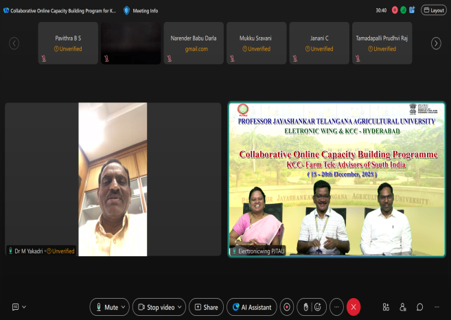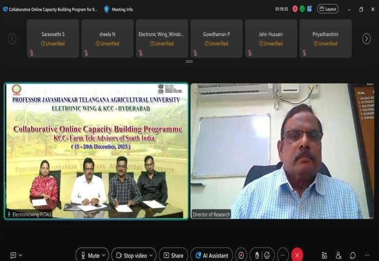 Electronic Wing, PJTAU and KCC, Hyderabad has jointly organized online training programme for Farm Tele Advisors of South India on “Capacity Building of FTAs” from 15th – 20th December, 2025. Chief guest of the Inaugural session Dr. M.Yakadri Director of Extension, PJTAU, Hyderabad in his introductory remarks stated that Farm Tele Advisors who act as the Frontline Extension workers can perform the role of Farmers Friends, through effective transfer of technology and it is of prime importance to update their knowledge on various burning farm issues and agricultural technologies, for effectively addressing the farmers queries. Dr. M. Balram, Director of Research, PJTAU attended the valedictory as chief guest, in his remarks stated that FTAs act as frontline warriors rescuing the farmers out of technical problems faced during the cultivation of crops by supporting them in right decision making. Various topics that were covered during the sessions were weed management in crops and cropping systems, advances in disease management technique, integrated pest management, market intelligence and price forecasting, seed production techniques and advances in micro irrigation.
