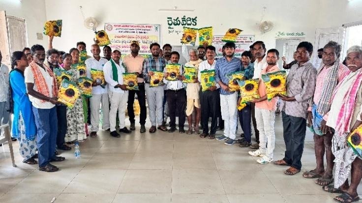 Krishi Vigyan Kendra, Bhadradri Kothagudem organized a distribution-cum-training programme on the promotion of oilseeds (Sunflower – KBSH-90) through the Cluster Front Line Demonstration at Bodu Rythu Vedika, Tekulapally Mandal, Bhadradri Kothagudem District on 14.11.2025. In this programme, Sri Koram Kanakaiah, Honourable MLA, Yellandu Constituency, participated and briefed farmers about the importance of crop diversification and encouraged them to make effective use of Krishi Vigyan Kendra services. Sri V. Baburao, District Agriculture Officer (DAO), explained the disadvantages of the maize–maize cropping system and its detrimental effects on soil health and the environment. Dr. T. Bharath, Programme Coordinator, explained sunflower crop management practices, the importance of incorporating cotton stalks into the soil, and the benefits of adopting the cotton/maize–greengram cropping system.