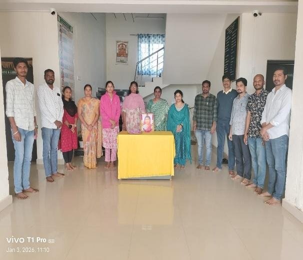 The birth anniversary (Jayanthi) of the eminent social reformer and pioneer of women’s education, Smt. Savitribai Phule, was observed on 3rd January, 2026 at KVK, Bellampalli. Dr. M. Prasuna, Programme Coordinator, garlanded the portrait of Smt. Savitribai Phule and paid homage by remembering her outstanding contributions towards women’s education, social equality and empowerment. The significance of her role as India’s first woman teacher.