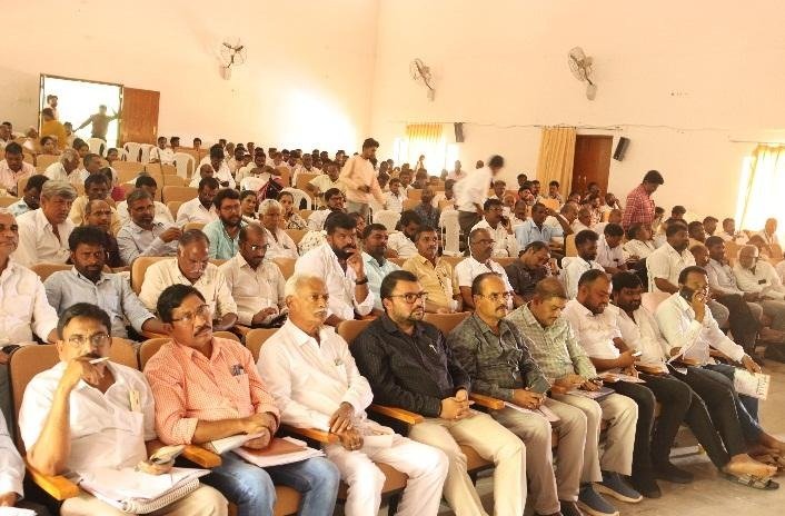 Sri. Vishnuvardhan Reddy, Chairman, BCCB, emphasized the goal of achieving self-sufficiency in foodgrains, pulses, and oilseeds, thereby reducing dependency on imports. Sri,Venkateswarlu, DHO, Dr. Rajini, DFO, Sri. Oblesh, DRDO official, Sri. Chandrashekhar, LDM, and Sri. Satyanarayana, Deputy Director of Dairy Development, shared their insights from their respective departments and encouraged farmers to adopt improved practices in agriculture, horticulture, fisheries, and animal husbandry. The technical session was led by Dr. O. Shaila, SMS (Plant Protection), Dr. Adhi Shankar, SMS (Horticulture), KVK, Palem, Dr. M. Shankar, Scientist (Entomology), Dr. M.M. Kada Siddappa, Scientist (Agronomy), RARS, Palem, and Sri Jagan and Sri Laxman, Horticulture Officers. The session covered various themes including best management practices in Rabi crops, horticultural crops, natural farming, oil palm production and subsidies, and IPDM practices. The programme concluded with a farmer–scientist interaction, during which the current crop conditions were reviewed and farmers’ queries were addressed by the experts. Sri. B. Santhosh, District Collector, Nagarkurnool, Sri. N. Yashwant Rao, District Agriculture Officer, Nagarkurnool, Sri Vishnuvardhan Reddy, Chairman, BCCB, Sri,Venkateswarlu, DHO, Dr. Rajini, DFO, Sri Oblesh, DRDO official, Sri Chandrashekhar, LDM, and Sri Satyanarayana, Deputy Director of Dairy Development, Dr. O. Shaila, SMS (Plant Protection), Dr. Adi Shankar, SMS (Horticulture), KVK, Palem, Dr. M. Shankar, Scientist (Entomology), Dr. M.M. Kada Siddappa, Scientist (Agronomy), RARS, Palem, and Sri Jagan and Sri Laxman, Horticulture Officers, All the supporting staff of KVK, Young professionals, 343 farmers, 124 farm Women thus a total of 522 members were participated.