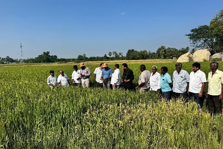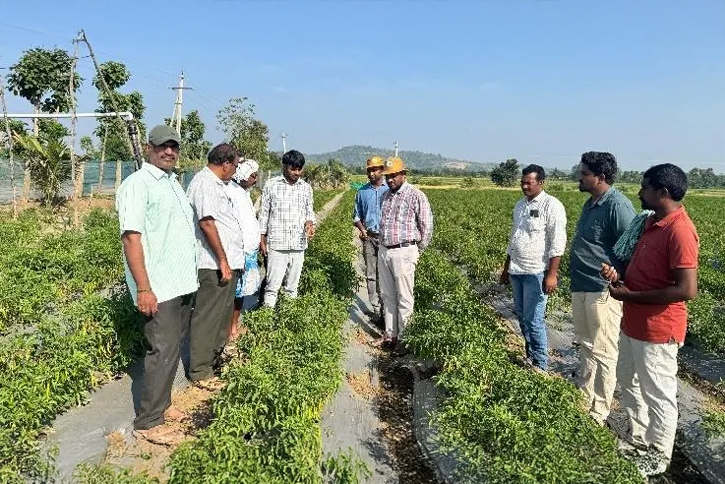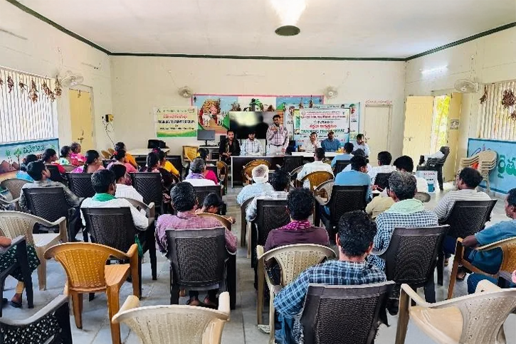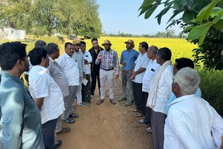 Krishi Vigyan Kendra, Bhadradri Kothagudem organized a training-cum-field visit in collaboration with the Agriculture Department at various villages of Charla and Dummugudem mandals on 13.11.2025. The training programmes were conducted on Integrated Crop Management (ICM) in paddy, cotton and chilli at Mahadevapuram Village, Dummugudem Mandal and Satyanarayanapuram Village, Charla Mandal. On this occasion, Dr. T. Bharath, Programme Coordinator briefed the farmers on integrated crop management practices in paddy, cotton, and chilli. This was followed by field visits to Mahadevapuram, Tageda and R. Kothagudem, where major pest and disease incidences such as panicle mite, false smut and bacterial leaf blight in paddy and Choenophora stem blight in chilli were identified. Suitable chemical and integrated management practices were recommended for remedial measures. Under the Tribal Sub Plan (TSP), battery-operated sprayers and nutrients were distributed to the participating farmers. In this programme, Dr. T. Bharath, Programme Coordinator, Sri. B. Sudhakar Rao, Assistant Director of Agriculture, Bhadrachalam Division, Dr. N. Hema Sarat Chandra, Scientist (Extension) Sri. B. Shiva, Scientist (Horticulture), AOs, AEOs and about 70 farmers actively participated.