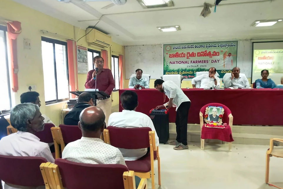 National Farmers’ Day (NFD) or Kisan Diwas (KD) celebrations were organised by the Regional Agricultural Research Station, Warangal, in coordination with Telangana Rythu Vigyan Kendras of Warangal, Jogipet, and Thornala on 23.12.2025. The chief guest of the programme, Associate Director of Research, RARS, Warangal, Dr. R. Uma Reddy, along with farmers, paid tribute to the Bharat Ratna Shri Chaudhary Charan Singh for his contributions to the farming community. Speaking on the occasion, he emphasized that only if the soil is good, the farmers will be good and only if the farmers are good, the country will be good, so farmers should protect the soil.
