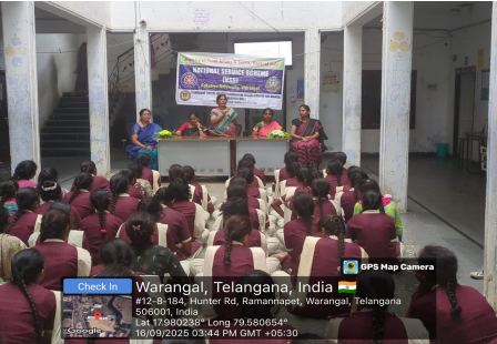 The NSS Programme Officers, Dr. B. Raju, Assistant Professors (SSAC) and Smt. K. Gopika, Assistant Professors (Pl. Path.) from Agricultural College, Warangal, organized an Awareness Programme on “Importance of Nutrition in Our Daily Life and Personal Hygiene to Adolescent Age Girls” on 16th September, 2025 at Telangana Social Welfare Residential Degree College for Women, Hunter Road, Hanamkonda.