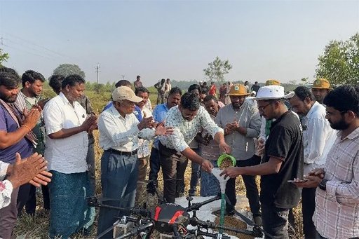 Krishi Vigyan Kendra, Bhadradri Kothagudem conducted a demonstration on paddy seeding through drone technology in collaboration with KVK, Adilabad at Sompalli Village, Burgampadu Mandal, Bhadradri Kothagudem District on 17.12.2025. During the programme, The Honourable District Collector & Magistrate, Sri Jitesh V. Patil garu, participated and interacted with the farmers. He emphasized the importance of adopting new technologies such as drone-based paddy seeding to overcome labour shortages and to achieve cost-effective farming. Dr. T. Bharath, Programme Coordinator, explained the role of drone technology in paddy cultivation, including direct seeding of paddy, herbicide application and pesticide spraying, highlighting its efficiency and precision.