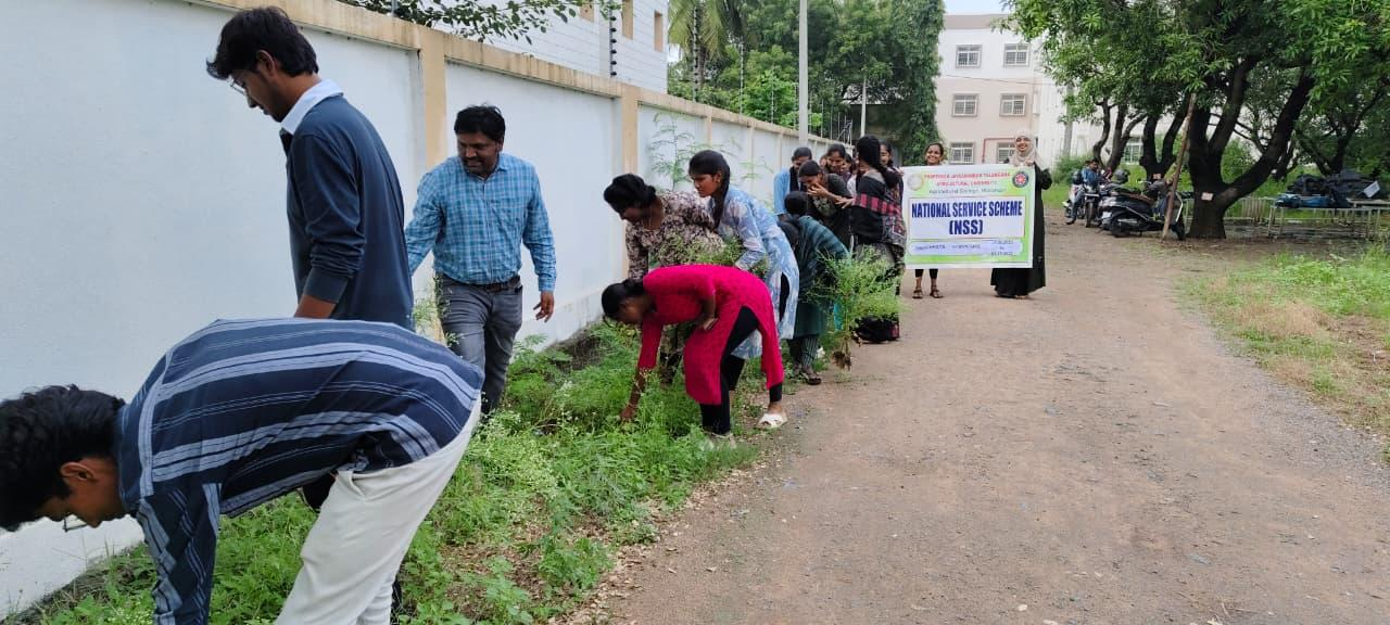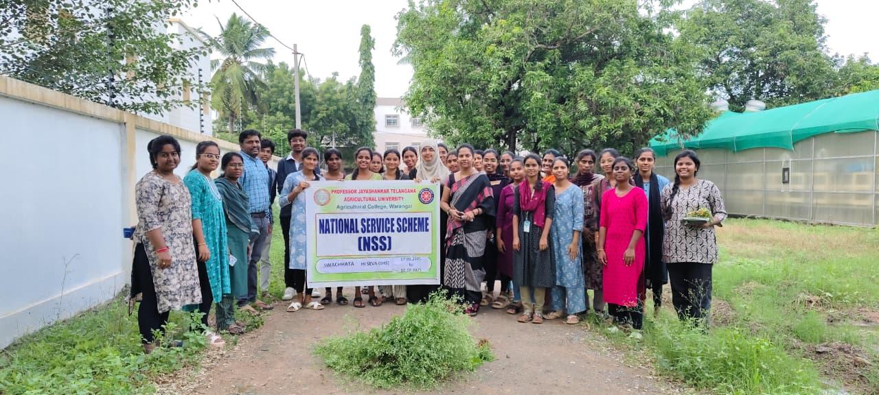 The NSS Units of Agricultural College, Warangal organized a Parthenium Eradication Programme near the Girls’ Hostel premises in the college campus under the Swachhata Hi Seva (SHS) Campaign 2025 on 26.09.2025. The programme was coordinated under the guidance of the NSS Programme Officers, Dr. B. Raju, Assistant Professor (SSAC), and Smt. K. Gopika, Assistant Professor (Plant Pathology).