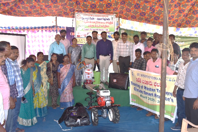 Krishi Vigyan Kendra, Bhadradri Kothagudem distributed physical inputs to the tribal farmers under Tribal Sub Plan 2024-25. In this programme Dr. T. Bharath, Programme Coordinator spoken about the mandate and implementation of scheme and also explained about the usage of different physical inputs i.e., Power weeder, Taiwan Sprayers, Battery operated sprayers, Tarpaulins and Micronutrients. Mr. B. Shiva, SMS (Horticulture) TSP (I/C) spoken about the details of developmental activities taken up at the TSP adopted villages. Later on, handed over the Power weeder, Taiwan Sprayers, Battery operated sprayers, Tarpaulins and Micronutrients to the beneficial farmers from the Bendalapadu village, Chandrugonda Mandal, Cherla village, Mandal. Dr. N. Hema Sarath Chandra, SMS(Extension) given vote of thanks. In this programme a total 75 Farmers and Farmwomen were participated and interacted with scientist.