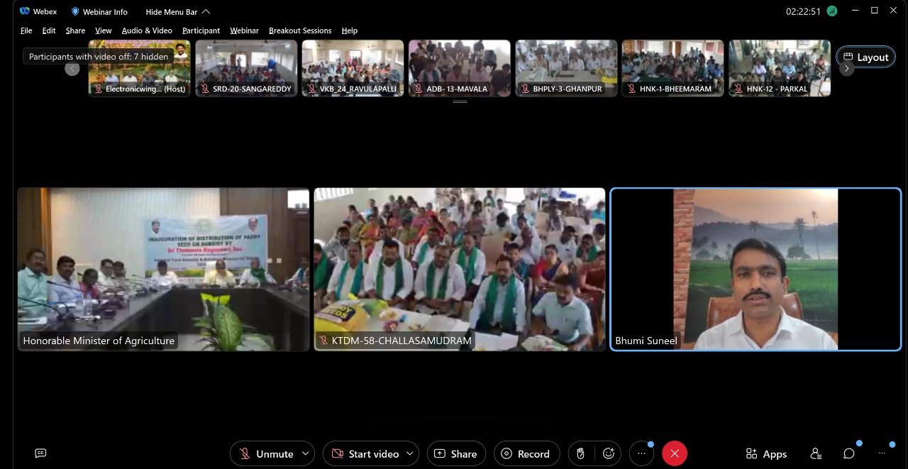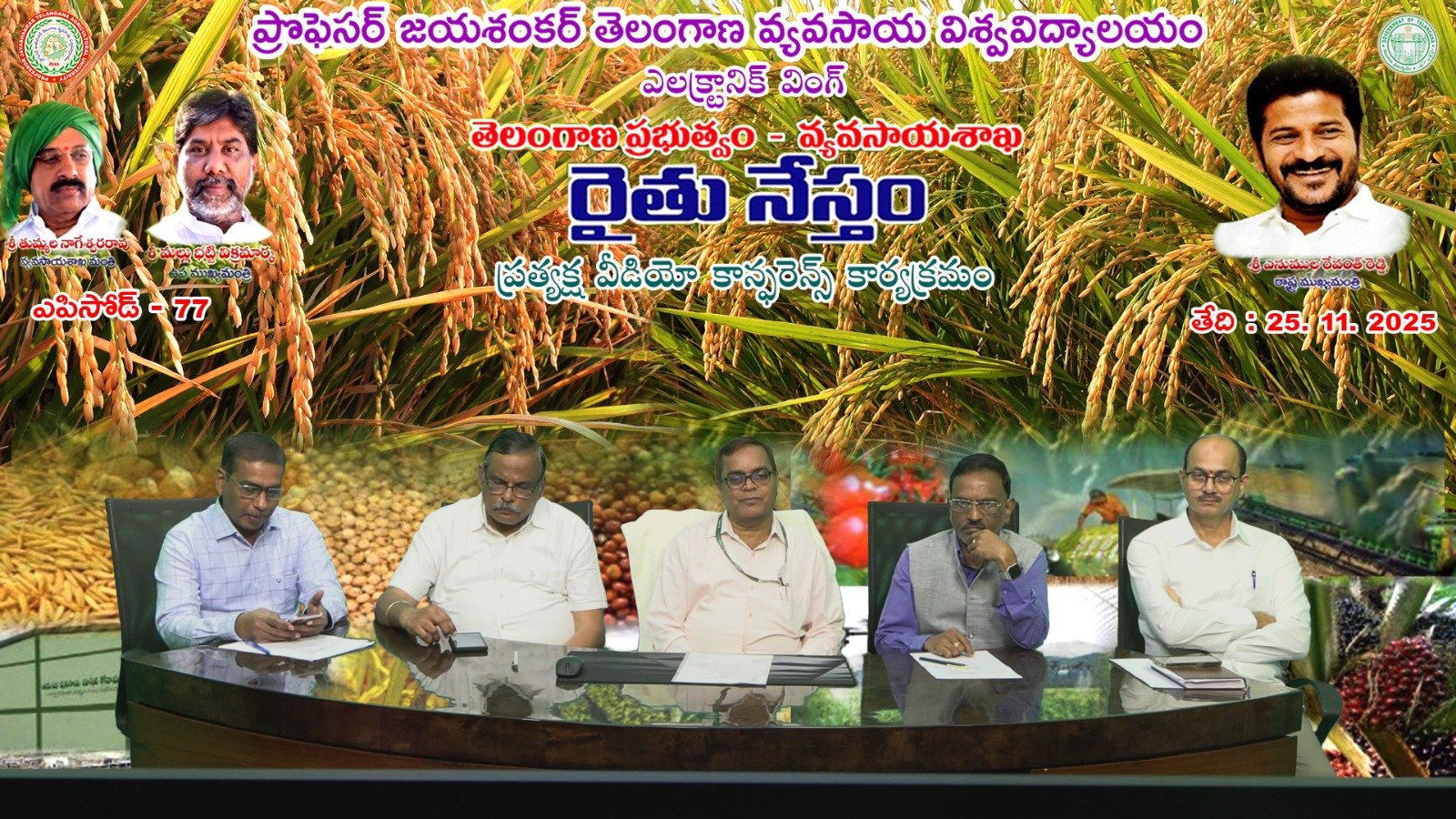 Rythu Nestham Live video conferencing of 77th episode was conducted from Electronic Wing Studio at ARI, Rajendranagar on 25-11-2025 from 10 AM to 11-40 AM. The programme started with Distribution of Paddy Seed under NFSM by Sri. Thimmala Nageshwara Rao, Hon’ble Minister for Agriculture. Draft Seed Bill-2025 presented by Seed section, O/o C&DA and interaction with farmers. Later Dr. R.Uma Reddy, Associate Director of Research, RARS, Warangal, enlightened farmers on efficient management of crop residues after harvest of Paddy and Cotton. The programme was graced by the presence of Prof.Aldas Janaiah, Vice chancellor, Dr. M.Balram, Director of Research, Dr. M. Yakadri, Director of Extension, Dr. M.V. Nagesh Kumar Director [Seeds] PJTAU.