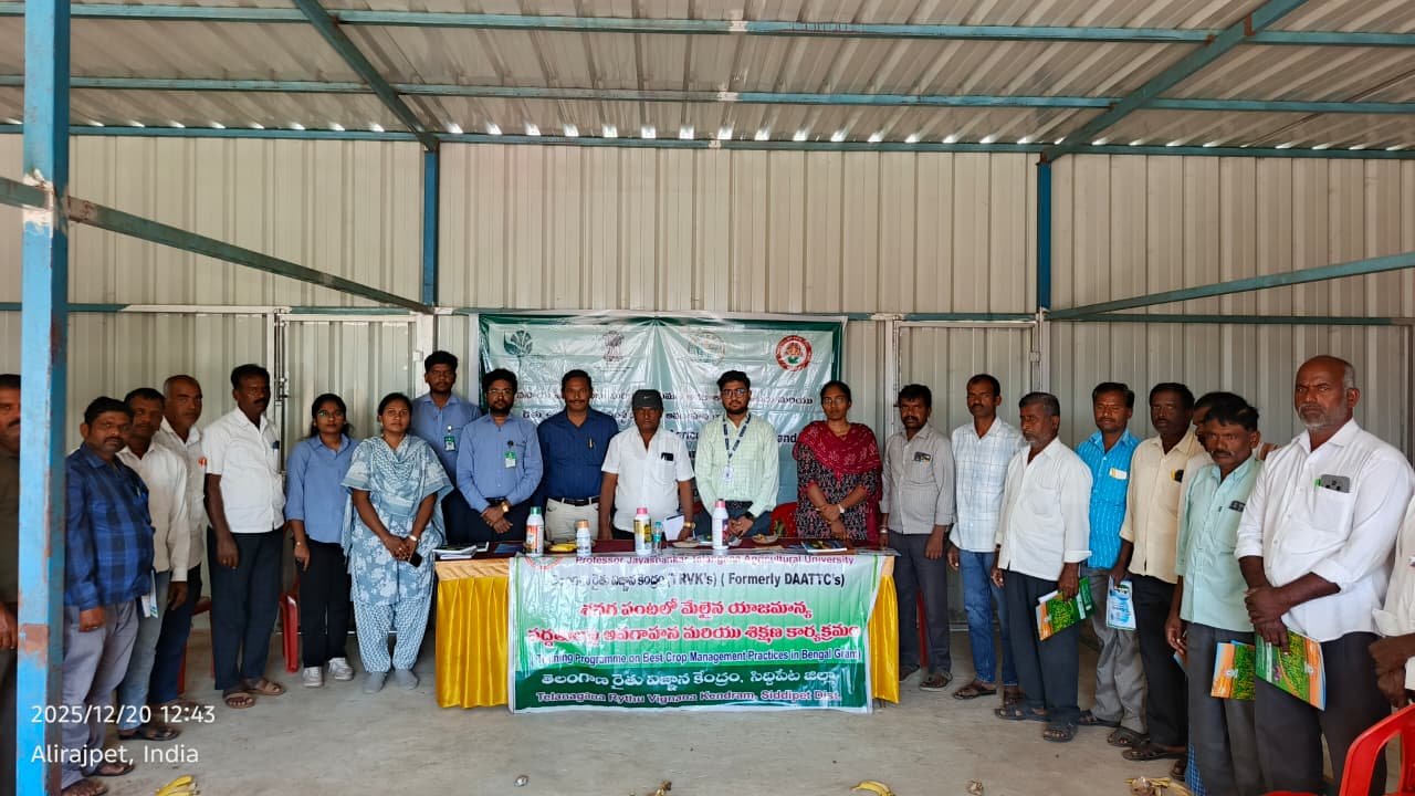 TRVK, Siddipet  organised the Training programme on ICM in Bengalgram on 20.12.2025 at Alirajpet village, Jagdevpur Mandal, Siddipet district. Dr. Ch. Pallavi, Coordinator & Scientist (CP), has explained the production practices which are helpful to improve the yields right from sowing to harvesting and given suggestions about on farm mechanization with NBeG -776 variety. She has explained the protection practices against the different pest and diseases which are associated with the Pulse crops especially about Pod borers and wilt. Mandal Agriculture Officer, Sri. U. Vasantha Rao has also suggested the other farmers to take the seed from farmers and grow in next season as the variety is excellent and suitable for combined harvester. A total of 50 farmers and Ms. Sharanya, Agriculture Extension Officer have participated in the programme.