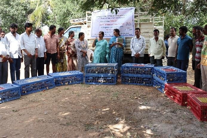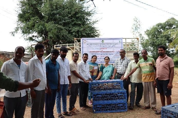 At the outset, Dr. Vijaya Lakshmi welcomed all the dignitaries and farmers for the training programme and also narrated it’s objectives of TSP in Agroforestry. Dr. Ramanjaneyulu explained about profitability of different Agroforestry tree species and also precautions to be taken while raising back yard poultry. Dr. Sreelatha apprised of the benefits under TSP and asked the beneficiary farmers to utilize the provisions for improving their livelihood. Dr. Anil Kumar cautioned about tree protection measures to be taken while raising tree saplings. Mr. Raju Naik, contact TSP beneficiary farmer thanked all the scientists for educating the beneficiary farmers. At the end, 542 poultry birds (Rajasri) of 5 weeks old (chicks) were distributed to 15 beneficiary farmers of Yavapur village under TSP.
