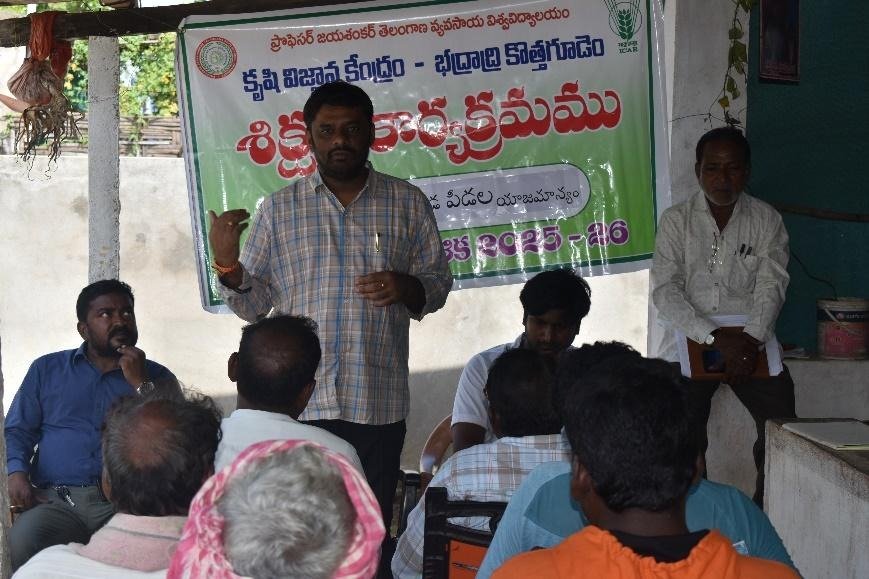 Krishi Vigyan Kendra, Bhadradri Kothagudem has conducted a training programme on pest and disease management in commercial crops at Ramachandrapuram village Julurupadu mandal on 22.10.2025. In this programme Dr. T. Bharath, Programme Coordinator briefed about judicious application of fertilizers at different stages of crops and also stressed on use of neem oil and sticky traps in chilli. Dr. N. Hema Sarath Chandra, SMS (Extension) explained about KVK activities taken up in the district. B. Shiva, SMS (Horticulture) explained about pest and disease management in chilli crop. Later on, visited cotton, chilli at Ramachandrapuram village Julurupadu mandal and paddy fields at Annarupadu village, Julurupadu mandal. In this programme Sri Deepak, agricultural officer, Julurupadu and Sri Gouse, AEO and Smt Bhanu, AEO and 65 framers participated and interacted with the farmers.