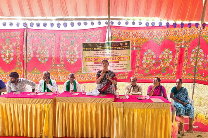 Telangana Rythu Vigyan Kendra(TRVK),PJTAU, Yadadri Bhuvanagiri District conducted a field day on high density planting system (HDPS)in cotton on 22nd November 2025 at the field of farmer Sri. Mandhadi Siddhareddy in Chandhupatla village, Bhuvanagiri Mandal, Yadadri Bhuvanagiri District. The event was conducted as part of a special project by the Central Institute of Cotton Reasearch (ICAR-CICR), Nagpur.